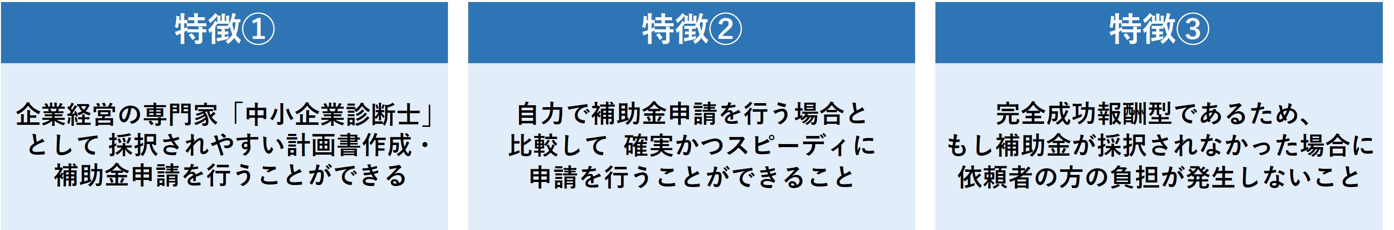 当事務所に補助金申請代行業務をご依頼いただくメリット・特徴は大きく以下の3点です。